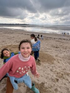 Nous avons appris comment la marée (avec ses coefficients allant de 20 à 120) façonne le paysage. Sur le sable, nous avons classé nos trouvailles en 4 cercles : minéraux, végétaux, déchets et animaux. Saviez-vous qu’un morceau de verre met plus de 500 ans à disparaître ? Nous avons fini la matinée par du Land Art : des baleineaux, des méduses, des ponts et des châteaux de sable entourés de coquillages.