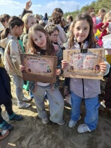 Puis il nous restait à retrouver le coffre à l’aide d’une carte…. Victoire ! Le coffre a été trouvé dans les dunes : il contenait des bijoux… et des Carambars !