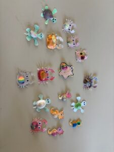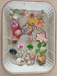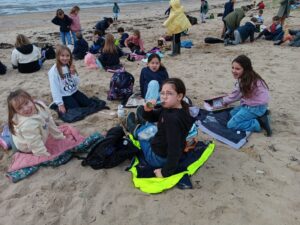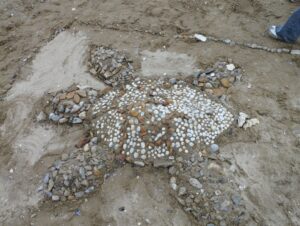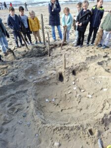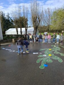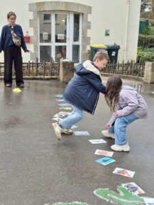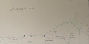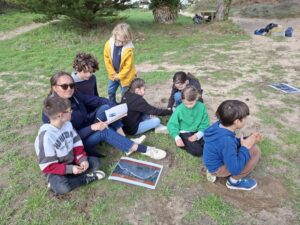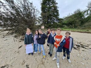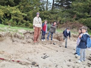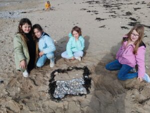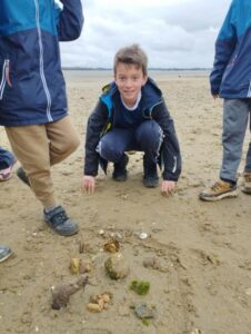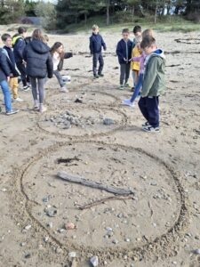 Nous avons appris comment la marée (avec ses coefficients allant de 20 à 120) façonne le paysage. Sur le sable, nous avons classé nos trouvailles en 4 cercles : minéraux, végétaux, déchets et animaux. Saviez-vous qu’un morceau de verre met plus de 500 ans à disparaître ? Nous avons fini la matinée par du Land Art : des baleineaux, des méduses, des ponts et des châteaux de sable entourés de coquillages.