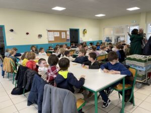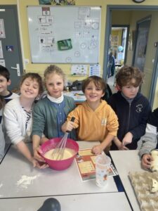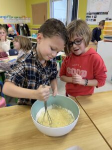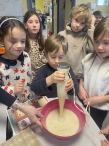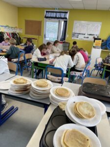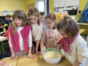 Pour la Chandeleur, les élèves de PS, CP et CE1 ont préparé des crêpes dans leur classe. Pour les plus grands, lecture de la recette, et plaisir de cuisiner pour tous! Après un long moment de cuisson (presque 200 mini crêpes!), nous avons partagé nos crêpes dans la cantine.
